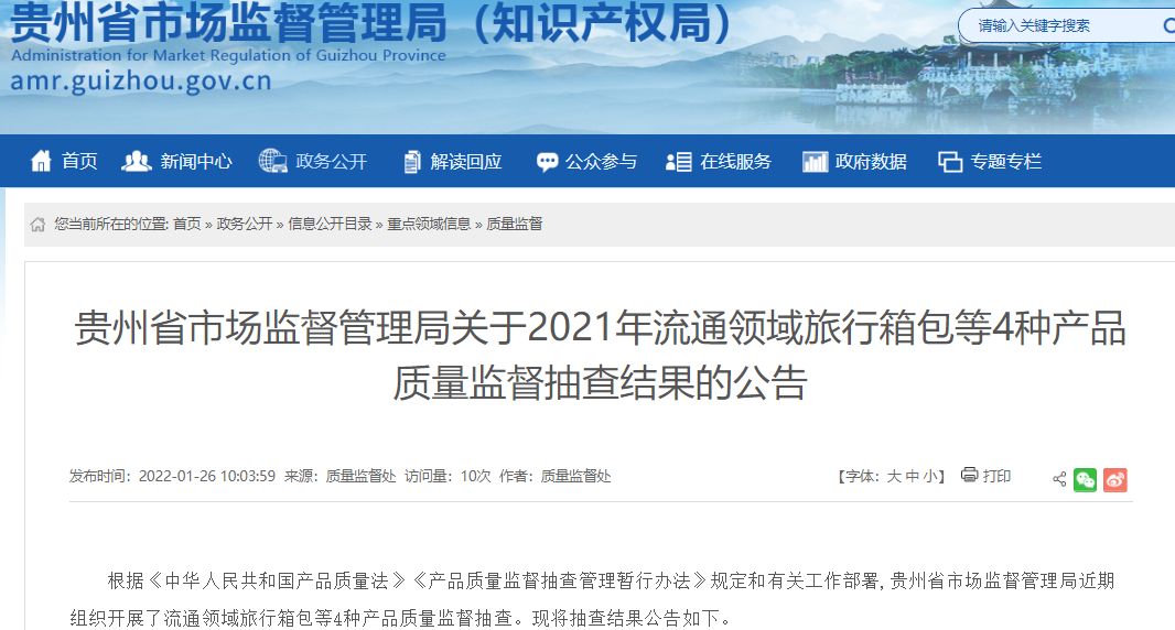中国经济网北京1月28日讯 1月26日,贵州省市场监督管理局网站公布了贵州省市场监督管理局关于2021年流通领域旅行箱包等4种产品质量监督抽查结果的公告。根据《中华人民共和国产品质量法》《产品质量监督抽查管理暂行办法》规定和有关工作部署,贵州省市场监督管理局近期组织开展了流通领域旅行箱包等4种产品质量监督抽查。