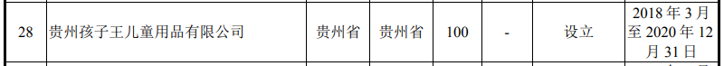 孩子王儿童用品股份有限公司(简称“孩子王”,301078.SZ)招股说明书显示,贵州孩子王儿童用品有限公司为其全资子公司。
