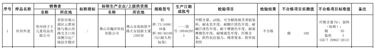 而13批次产品不合格产品中,有2批次来自贵州孩子王儿童用品有限公司。标称佛山市瀚洋科技有限公司生产的、贵州孩子王儿童用品有限公司销售的针织外套显示不合格。不合格项目实测值为棉 100,而标准值为纤维含量(%):面料(标称):棉 95 氨纶 5(GB/T 29862-2013)。该批次产品规格型号为检样:73/4490/48 备样/48100/52(耐久性标签),生产日期或批号为---/款号:180462073。