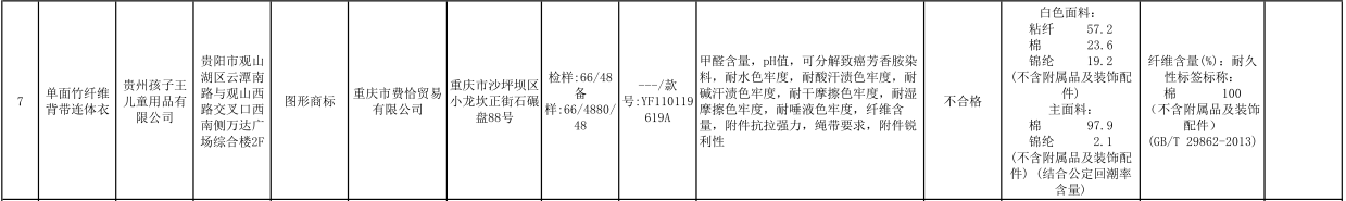 同时,标称重庆市费恰贸易有限公司生产的、贵州孩子王儿童用品有限公司销售单面竹纤维背带连体衣显示不合格。不合格项目实测值为白色面料:粘纤 57.2 棉 23.6 锦纶 19.2 (不含附属品及装饰配件);主面料:棉 97.9 锦纶 2.1 (不含附属品及装饰配件)(结合公定回潮率含量),而标准值为纤维含量(%):耐久性标签标称:棉 100 (不含附属品及装饰配件)(GB/T 29862-2013)。该批次产品规格型号为检样:66/48 备样:66/4880/48,生产日期或批号为---/款号:YF110119619A。