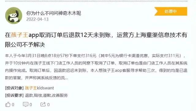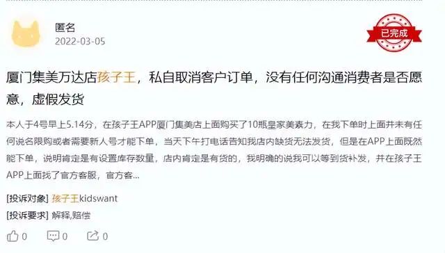 天府财经网通过黑猫投诉平台检索发现,一位来自厦门的孩子王App用户今年3月也遇到了类似情况。该用户通过App在孩子王厦门集美店内成功下单,却因店内缺货而无法发货。不仅如此,客服还会私自取消客户的订单。而取消订单后又迟迟不予退款。