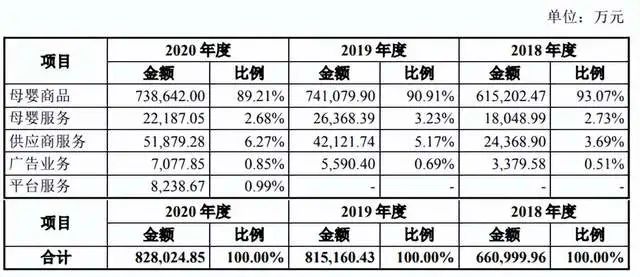 天府财经网注意到,母婴商品是孩子王营收的绝对主力,2018-2020年母婴商品贡献的销售收入占其主营业务收入的比例分别为93.07%、90.91%和89.21%,而作为毛利率高达90%以上的母婴服务业务,营收占比只在2%至3%间徘徊。