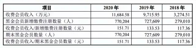 以付费会员为例,截至2020年末,公司黑金PLUS会员规模有77.02万人,而2019年末、2018年末的规模分别是72.76万人、27.90万人,意味着2020年只新增了4.26万人,比2019年少增了40.6万人。