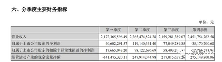 以季度财务数据分析,其中第二季度最高,将近是第一季度的三倍,比三季度也多出不少,而第四季度的净利润却出现了较大的负值。