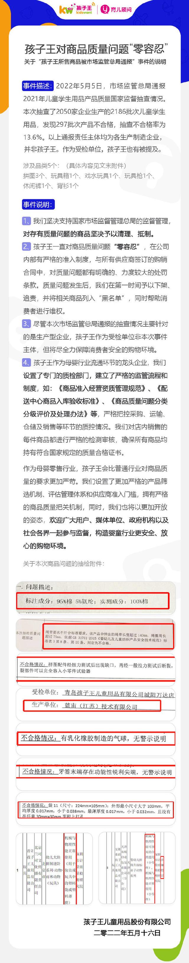 而之所以会在今天发布这样一则说明,原因还要从今年5月5日,市场监管总局通报2021年儿童学生用品产品质量国家监督抽查情况后说起。该通报指出,本次抽查了2050家企业生产的2186批次儿童学生用品,发现297批次产品不合格。其中,“孩子王”有7家子公司和门店上榜,涉及婴童服装、幼儿拼图玩具、戏水玩具、套枪玩具等,部分产品涉嫌假冒。