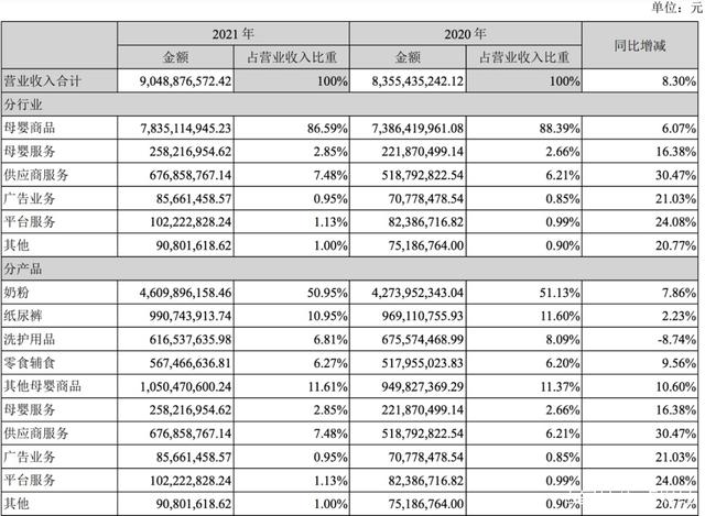 时至2021年,以公司年度总营收为分母计算,孩子王来源于母婴商品的收入占比仍在八成以上,为86.59%;而来源于奶粉的收入占比也仍在五成以上,为50.95%。