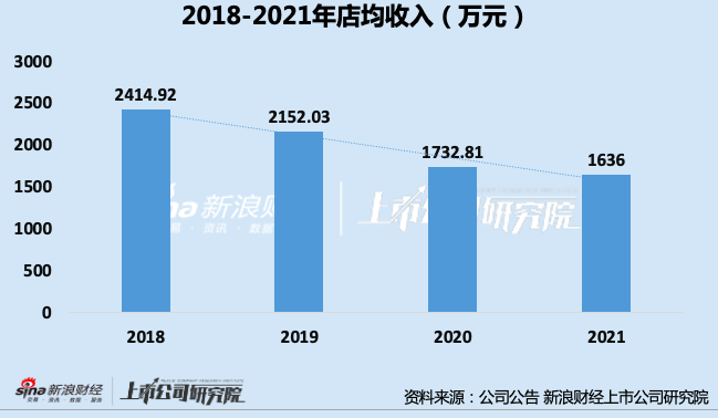然而,线下直营门店的增长并未带来公司业绩的同步增长,在2022年前3季度甚至出现了负增长。在此影响之下,公司店均收入逐年下滑,2018-2021年,公司门店的店均收入分别为 2414.92 万元、2152.03 万元、1732.81 万元和1636万元。