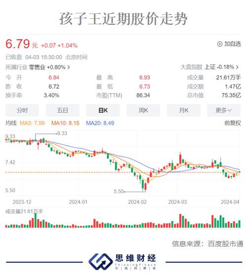 时间回溯至2021年10月,孩子王上市当日股价就达到23.3元/股,较5.77元/股的发行价增长超300%,市值超250亿元。近两年来其股价均徘徊在13元/股上下,最近在今年2月创下5.5元/股历史新低后出现反弹。截至4月3日收盘,该股报6.79元/股,总市值75亿元。