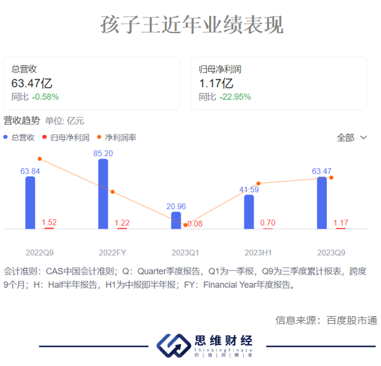 孩子王2023年三季报显示,公司主营收入63.47亿元,同比下降0.58%;归母净利润1.17亿元,同比下降22.95%。
