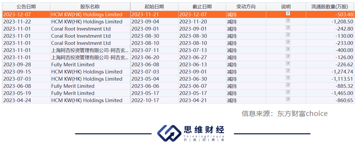 与此同时,重要股东也在减持过程中。根据公告,2023年,股东Fully Merit Limited合计减持885.32万股,HCM kW(HK) Holdings Limited 减持1113.51万股。南京维盈创业投资合伙企业减持2656.43万股。