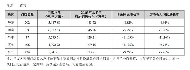 然而,从核心经营数据的下滑中可窥见,孩子王对乐友国际的并购,如今正经历阵痛。2025年上半年,乐友国际直营店坪效同比下滑9.69%至5241.61元/平方米,店均销售收入则下降5.45%至133.81万元。对此,孩子王解释称,主要原因是4月份对分公司组织架构进行了全面调整,与孩子王分公司合并,对一线门店运营造成一定影响。