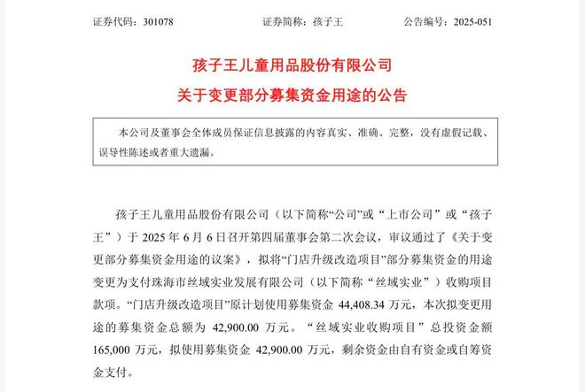 还需要注意的是,孩子王此前曾出现多番调整募资用途的情况。2023年,孩子王曾发行可转换公司债券募集资金净额约10.24亿元,随后在今年,孩子王先是将原定用于零售终端建设及智能化物流中心建设项目的部分资金调用于“门店升级改造项目”和“孩子王华北智慧物流基地和区域结算中心项目”,后又为了收购丝域实业,变更了“门店升级改造项目”4.29亿元的资金用途。