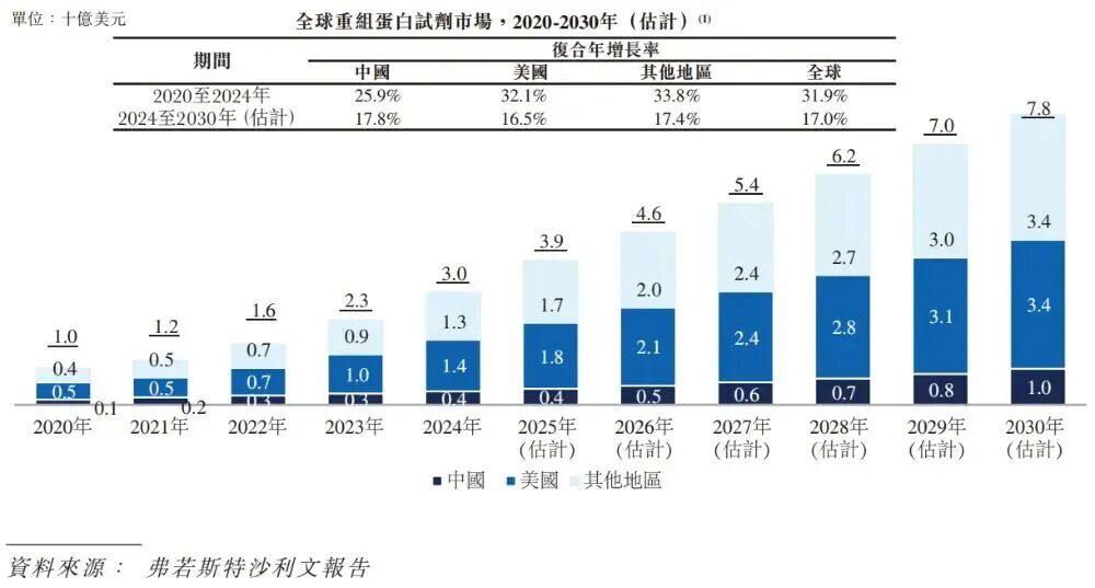 根据弗若斯特沙利文(Frost & Sullivan)报告,2020年,全球及中国重组蛋白市场分别达10亿美元及1亿美元,分别以复合年增长率31.9%及25.9%达到2024年的30亿美元及4亿美元。预测该等市场将进一步扩张至2030年的78亿美元及10亿美元,2024年至2030年的复合年增长率分别为17.0%及17.8%。
