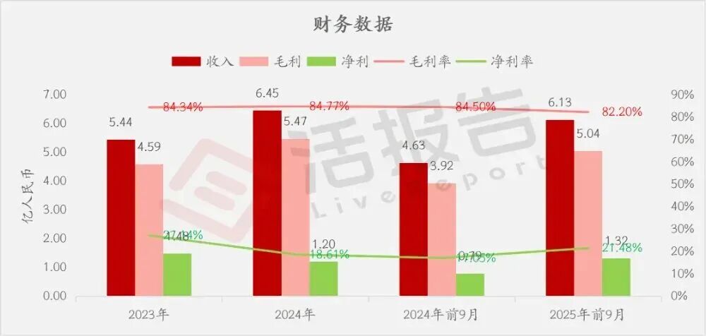 收入分别约为人民币5.44亿、6.45亿、4.63亿、6.13亿,2025年前9月同比+32.26%;