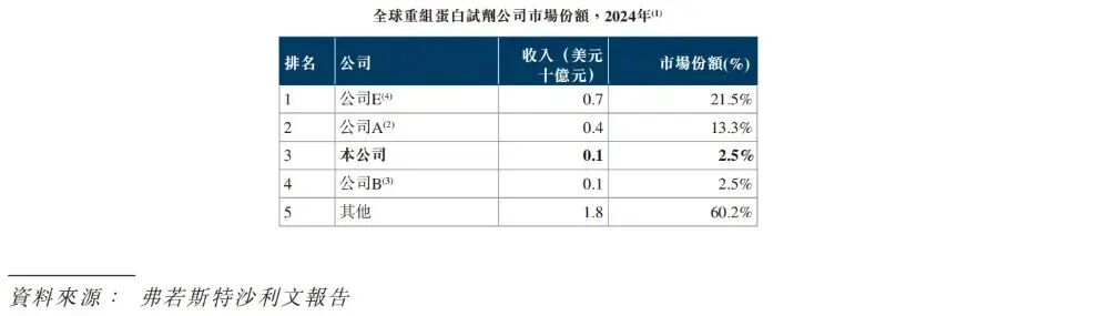 2024年,按收入计,全球重组蛋白市场前四大供应商的市场份额合计为39.8%。在全球重组蛋白市场中,公司在所有供应商中排名第三且在全球所有中国本土供应商中排名第一,市场份额约为2.5%。