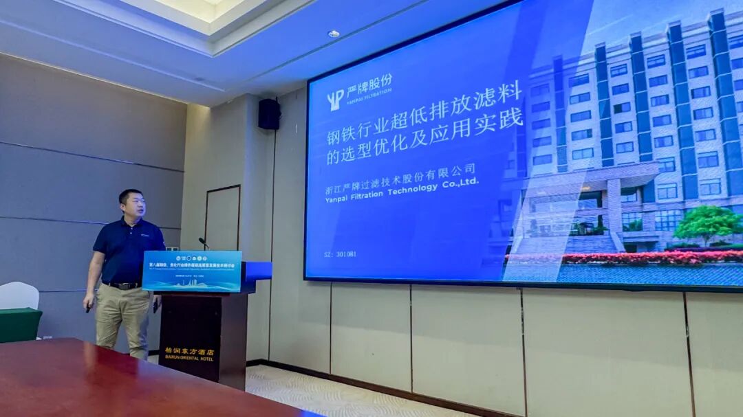 严牌股份大气事业部总监马磊作为企业技术代表出席了本次研讨会。在“钢铁细颗粒物超低排放技术与系统节能”专题汇报分会场,钢铁行业销售经理赵永昌向与会专家介绍了严牌股份在钢铁超低排放领域的优势产品及其取得的成果。