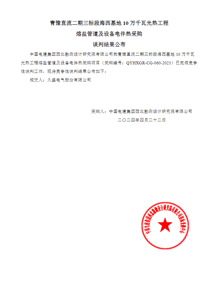 4月22日,中国电建就西北院青豫直流二期三标段海西基地10万千瓦光热工程熔盐管道及设备电伴热设备采购项目发布成交公示,成交人为:CSPPLAZA平台会员单位——久盛电气股份有限公司。