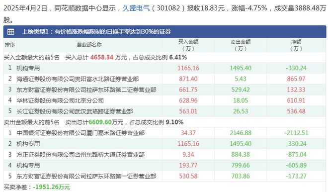 4月2日,久盛电气因日换手率达36.30%再次登上龙虎榜,当日报收18.83元,涨幅-4.75%,成交量3888.48万股。
