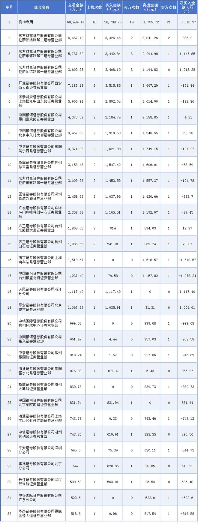 此外,共计31家证券营业部上榜,拉萨天团位列交易金额前三,共上榜11次,其中买方8次,卖方3次。