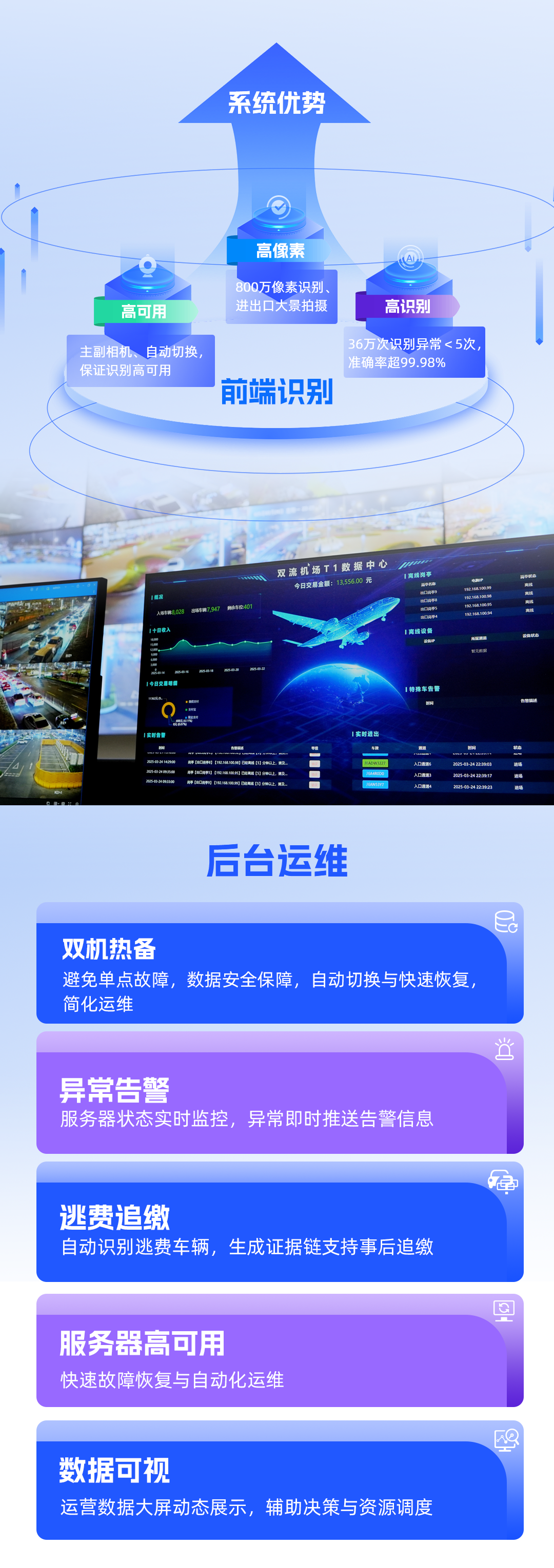 为提高停车场通行效率,T1航站楼停车场采用无人值守管理方案,结合车牌识别、移动支付、集中远程运维等技术,实现了快速识别、快速支付、快速处理。