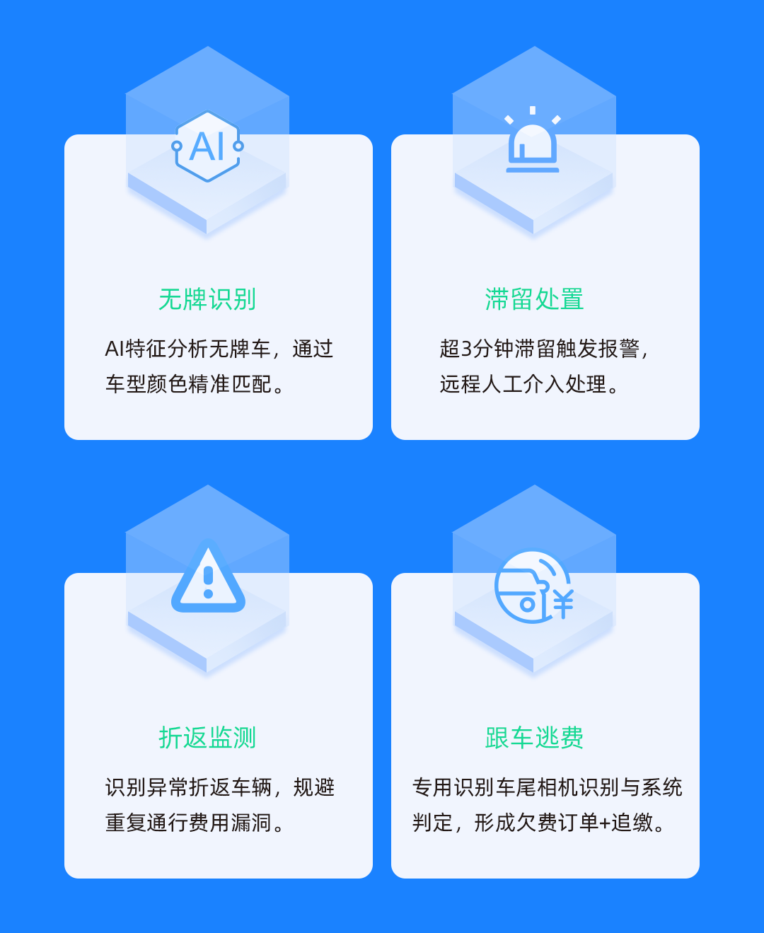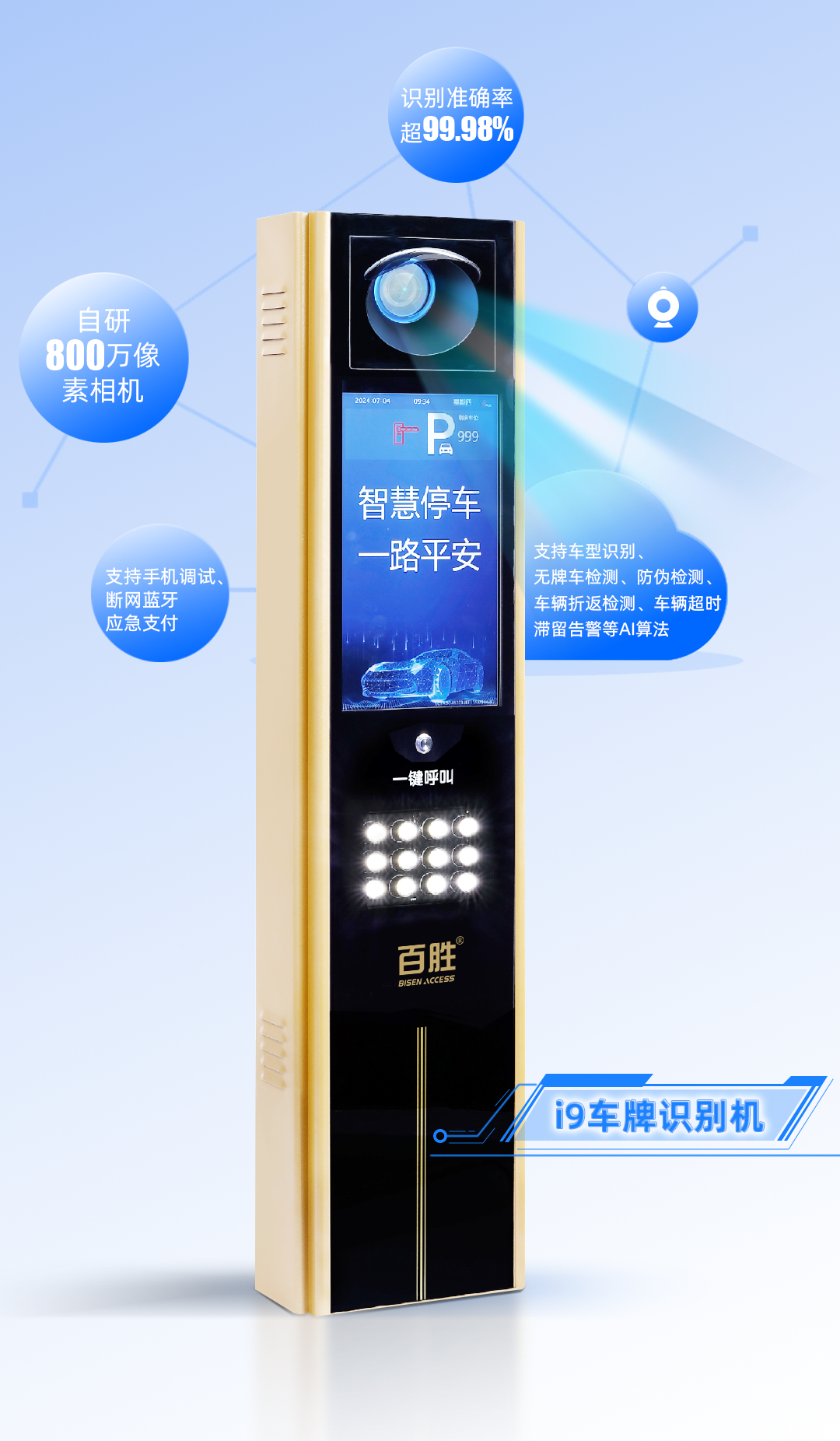 前端识别采用艾视特i9系列车牌识别机,该款行业领先的800万像素车牌识别相机,成像更清晰、识别更精准,全天候识别率超99.98%;支持车型识别、无牌车检测、防伪检测、车辆折返检测、车辆超时滞留告警等AI算法,并支持手机调试、断网蓝牙应急支付等功能。
