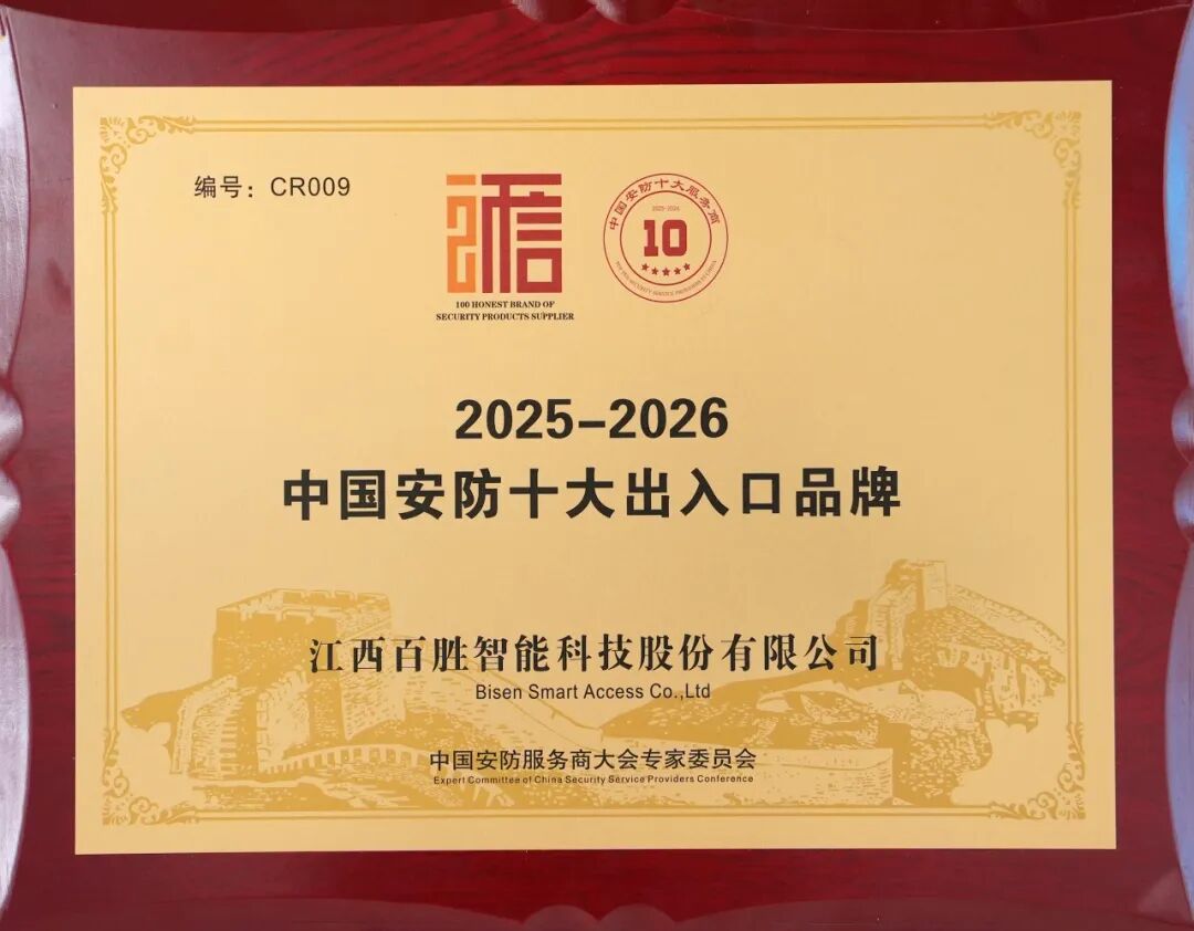 经过中国安防服务商大会专家委员会的严格评审,百胜智能凭借其在智能安防与物联网融合创新方面的卓越表现,荣获2025-2026年度“中国安防十大出入口品牌”殊荣。