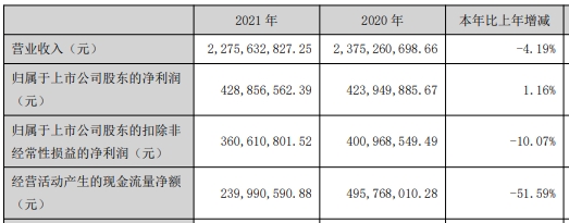 2022年4月20日,可孚医疗发布了上市后的首份年报。2021年,公司实现营业收入22.76亿元,同比减少4.19%;实现归属于上市公司股东的净利润4.29亿元,同比增长1.16%;归属于上市公司股东的扣除非经常性损益的净利润3.61亿元,同比减少10.07%;经营活动产生的现金流量净额2.40亿元,同比减少51.59%。