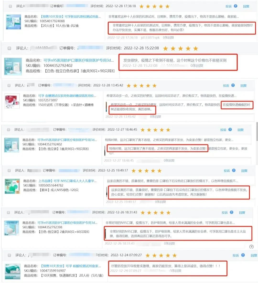 物流端亦是如此。可孚医疗拥有行业内规模较大、专业的仓储发货系统及分拣设备,在订单量暴增、人员减员的情况下,迅速采取措施,通过紧急招聘、员工外包等形式恢复、提升发货量。此外,为了缓解由于物流作业操作能力下降60%带来的快递流通速度下降问题,公司还通过调配车辆、在装货及卸货上提供帮助等方式,最终实现发货量单日增长200%。
