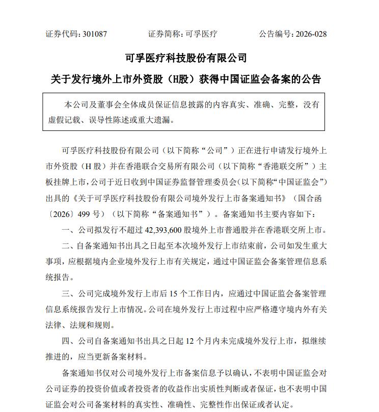 3月16日,港交所披露易官网显示,可孚医疗(301087)科技股份有限公司(以下简称"可孚医疗")向港交所主板递交上市申请。3月9日,可孚医疗(301087)发布公告,公司于近日收到中国证券监督管理委员会出具的《关于可孚医疗科技股份有限公司境外发行上市备案通知书》,公司拟发行不超过4239.36万股境外上市普通股并在香港联交所上市。