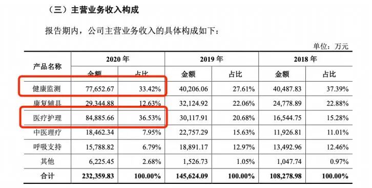 2021年,可孚医疗在深交所创业板上市,根据该公司A股招股书,其最初主营业务集中在两大板块:一是健康监测产品,比如体温计、血压计、血氧仪等;二是医疗护理用品,涵盖口罩、纱布、消毒用品等,背背佳所属的矫姿带业务还未出现在业务版图中。