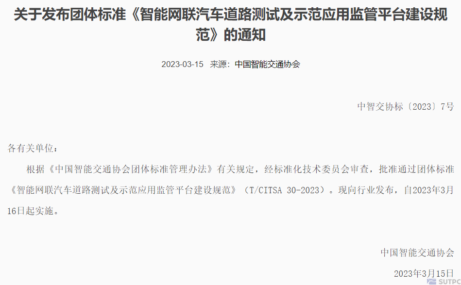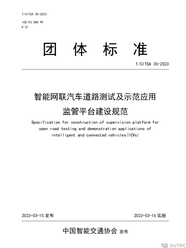 日前,由深圳市城市交通规划设计研究中心股份有限公司(以下简称“深城交”)牵头,联合深圳市智慧城市通信有限公司、腾讯云计算(北京)有限责任公司等9家行业合作伙伴编制的《智能网联汽车道路测试及示范应用监管平台建设规范》(T/CITSA 30-2023)在中国智能交通协会官网正式印发。