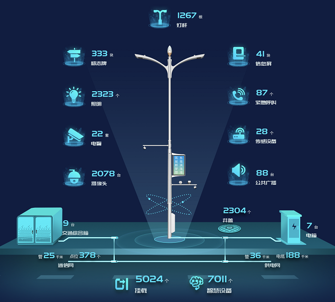 为破解上述难题,东莞滨海湾新区交椅湾板块已建(在建)的市政道路,通过对公安、交警、交通、城管、电信运营商等立杆需求的精准分析,实现路面杆体100%合杆建设。合杆后,路面仅分为两类杆——普通照明杆(占比约45%)和多功能杆(占比约55%)。合杆之后,每一类杆体的需配套设施的建设体量也得到控制,有效减少建设成本。