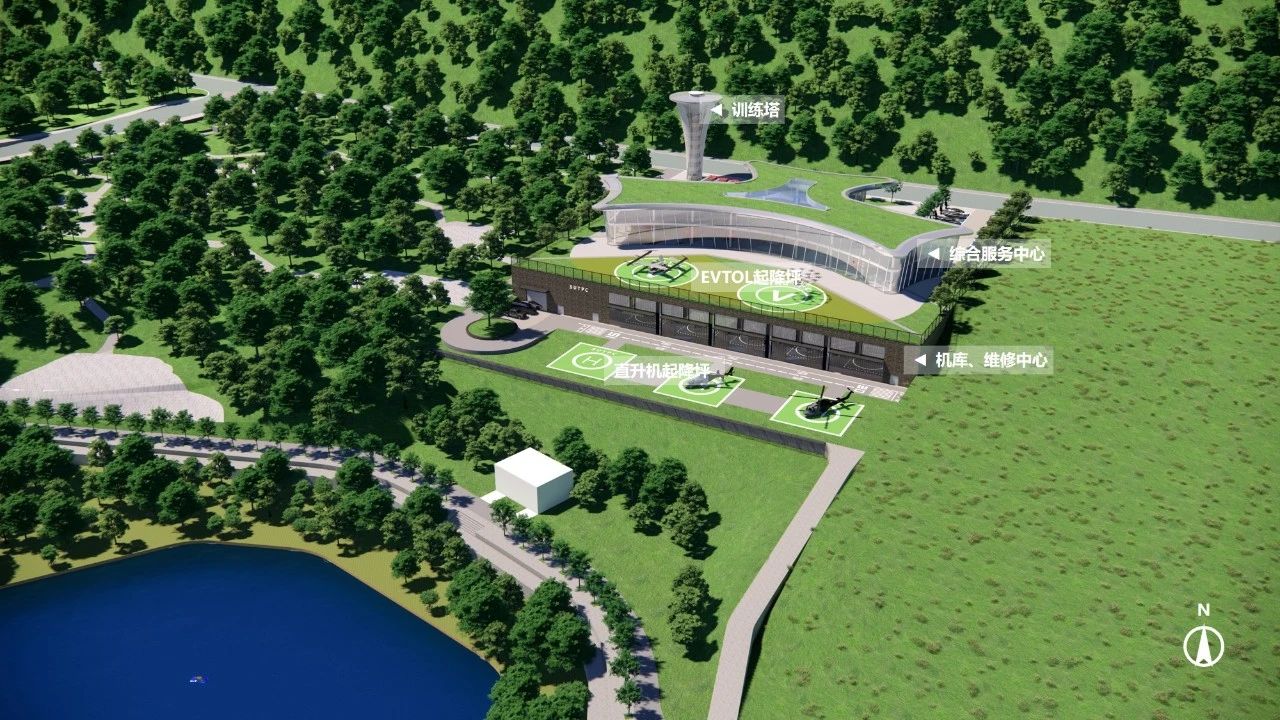 硬件设施:包含5个eVTOL/直升机起降场、1座综合服务中心、1座机库及维修中心、以及消防训练塔和无人机超充设施等,全面保障无人机试飞试验、检测检验需求;