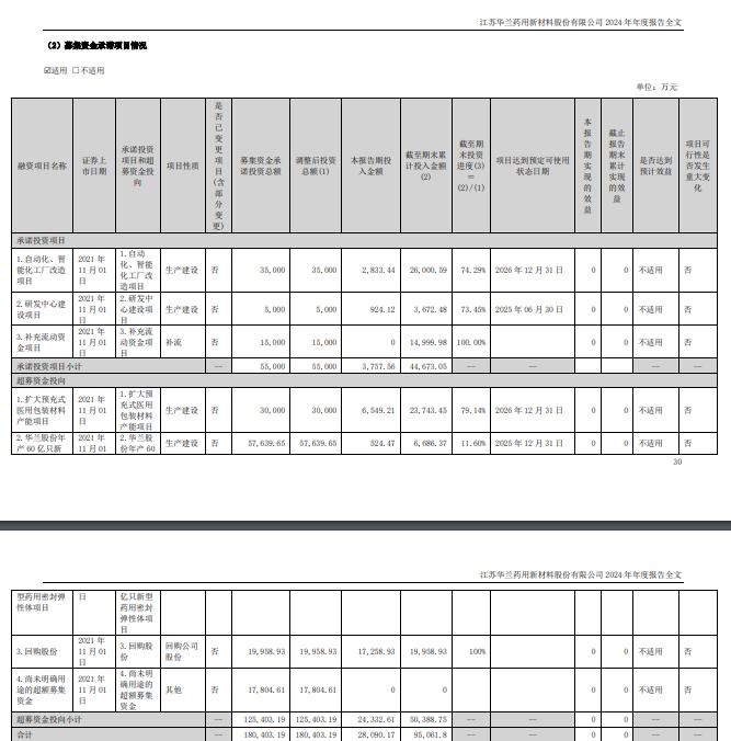 华兰股份2021年IPO时募资总额19.55亿元,净额18.04亿元。其中,承诺投资项目有三个,分别为自动化和智能化工厂改造项目、研发中心建设项目、补充流动资金项目。超募资金也投向了三个项目,扩大预充式医用包装材料产能项目、年产60亿只新型药用密封弹性体项目、回购股份。