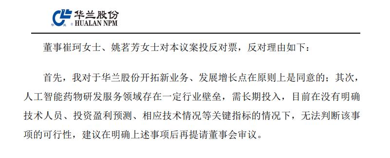 该议案以7票同意、2票反对的结果通过。董事崔珂和姚茗芳的反对理由为:对于公司开拓新业务、发展增长点在原则上是同意的;其次,人工智能药物研发服务领域存在一定行业壁垒,需长期投入,目前在没有明确技术人员、投资盈利预测、相应技术情况等关键指标的情况下,无法判断该事项的可行性,建议在明确上述事项后再提请董事会审议。