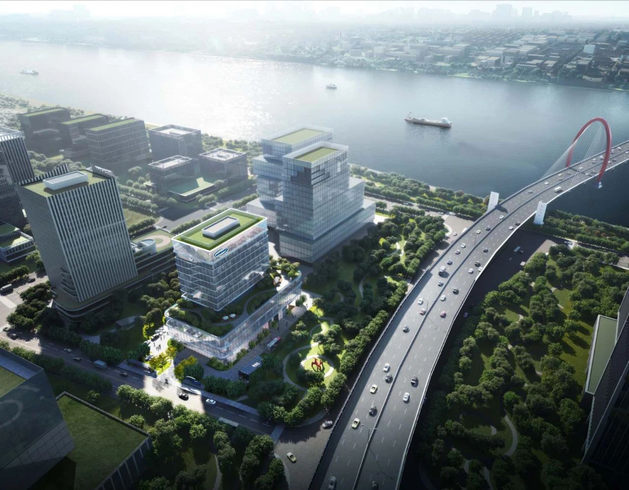 该建筑的设计灵感来源于丰富多变的集成电路形态,充分展现了广立微的行业特点。同时,建筑充分利用地块的面宽,使钱塘江的一线景观资源得到最大化利用。建筑的外观现代、优雅、灵动,总体风格与周边建筑协调一致,展现出广立微公司低调内敛、务实有为的气质底蕴。