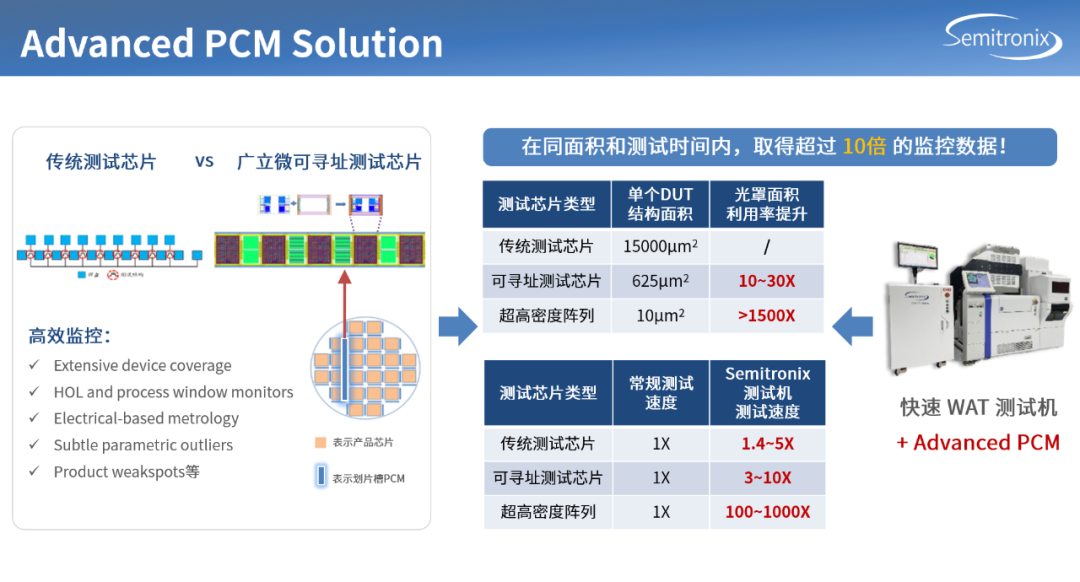 广立微独有的可寻址技术,有效提升面积利用率,光罩面积利用率可提升10-1500倍,释放更多划片槽可利用面积。Adv-PCM通过设计与测试协同,实现保障高质量量产。