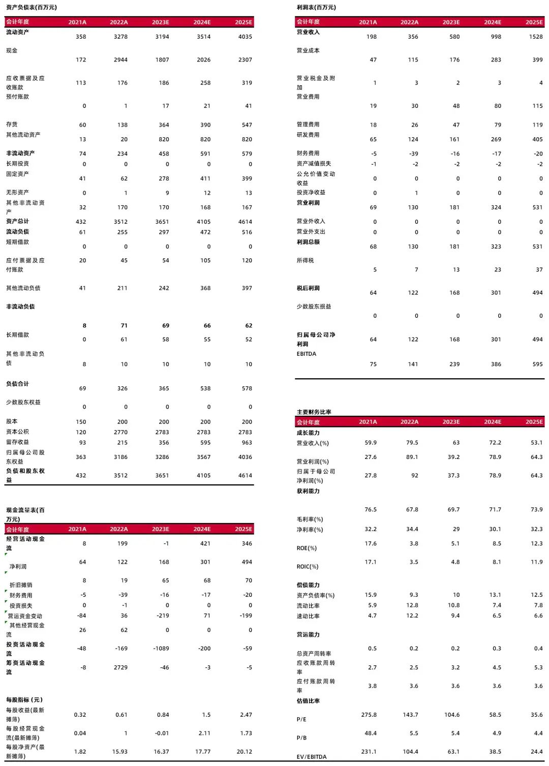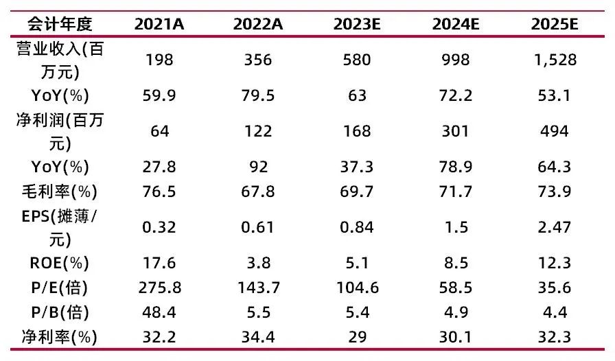 预计2023-2025年,公司营业收入分别为5.80/9.98/15.28亿元(原值6.38/10.03/17.01亿元),同比63.0%/72.2%/53.1%;归母净利润分别为1.68/3.01/4.94亿元(原值1.91/3.32/6.15亿元),同比增长37.3%/78.9%/64.3%,对应EPS为0.84/1.50/2.47元。以2023年10月27日收盘价87.90元计算,2023-2025年PE分别为104.6X/58.5X/35.6X。维持“买入-A”评级。