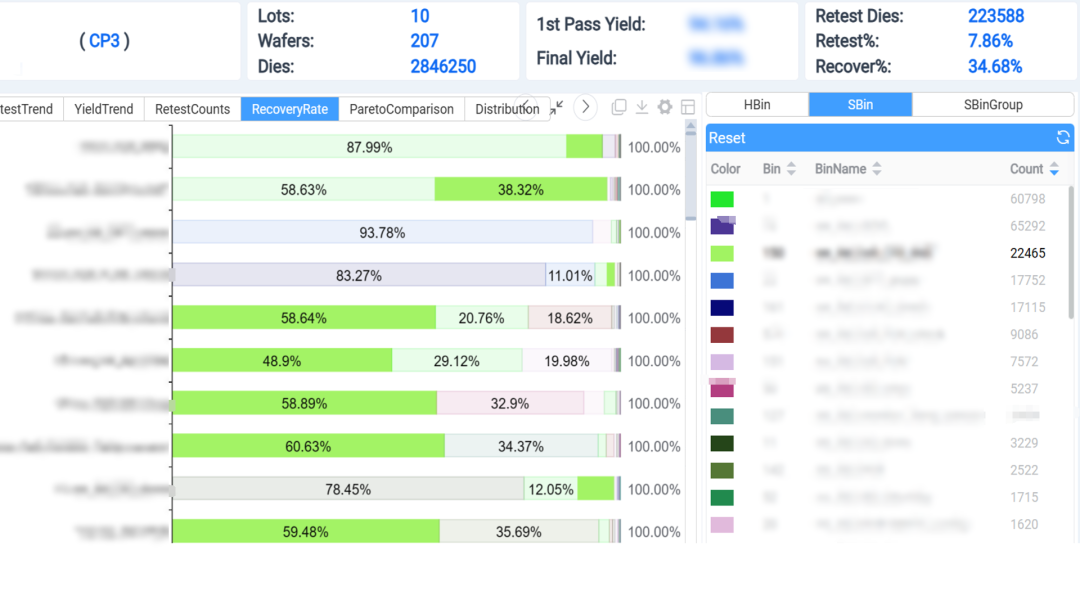 例如,客诉发生时,YMS可以协助迅速找到失效样品的所有数据信息,如批次、WAT、CP、FT等等是否有异常,实现全制程数据追踪;DE-YMS可实现跨站关联性分析,WAT参数与CP/FT各站点良率、失效Bin、参数相关性分析将帮助失效项原因追溯,不再是只见树木不见森林,借助数据间的关系来对异常进行立体化诊断;同时DE-YMS良好的交互方式使得多维度探索变得便利,可以很轻松的进行测试厂之间,测试机之间,S2S之间的良率差异,参数差异,Bin分布差异,Map差异等比较分析。