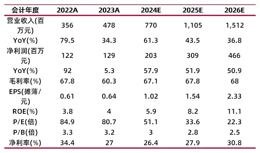预计2024-2026年,公司营业收入分别为7.70/11.05/15.12亿元,同比61.3%/43.5%/36.8%;归母净利润分别为2.03/3.09/4.66亿元,同比增长57.9%/51.9%/50.9%,对应EPS为1.02/1.54/2.33元。以2024年5月6日收盘价51.95元计算,2024-2026年PE分别为51.1X/33.6X/22.3X。维持“买入-A”评级。