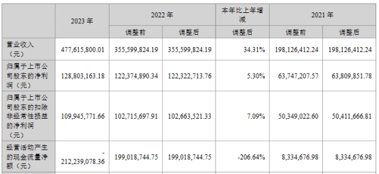 2023年年报显示,去年,公司实现营业收入4.78亿元,同比增长34.31%;归母净利润1.29亿元,同比增长5.30%;扣非净利润1.10亿元,同比增长7.09%;经营活动产生的现金流量净额为-2.12亿元,上年同期为1.99亿元。