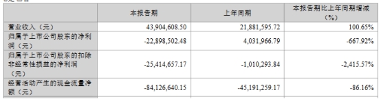 2024年第一季度,公司实现营业收入4390.46万元,同比增长100.65%;归母净利润-2289.85万元,上年同期为403.20万元;扣非净利润-2541.47万元,上年同期为-101.03万元;经营活动产生的现金流量净额为-8412.66万元,上年同期为-4519.13万元。