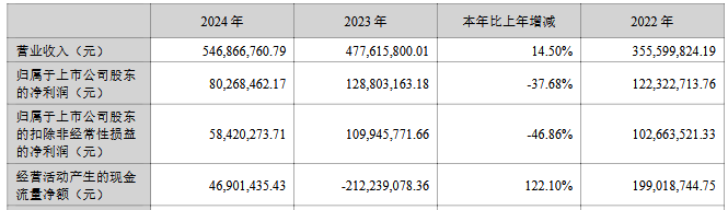 2024年,公司实现营业收入5.47亿元,同比增长14.50%;归属于上市公司股东的净利润为8,026.85万元,同比下降37.68%;归属于上市公司股东的扣除非经常性损益的净利润为5,842.03万元,同比下降46.86%;经营活动产生的现金流量净额为4,690.14万元,上年同期为-2.12亿元。