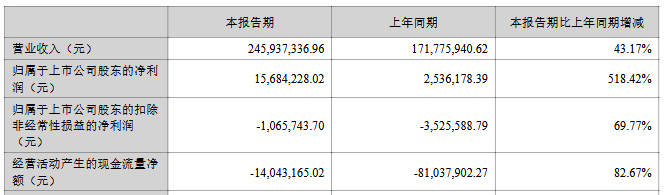 2025年1-6月,公司实现营业收入2.46亿元,同比增长43.17%;归属于上市公司股东的净利润为1,568.42万元,同比增长518.42%;归属于上市公司股东的扣除非经常性损益的净利润为-106.57万元,上年同期为-352.56万元;经营活动产生的现金流量净额为-1,404.32万元,上年同期为-8,103.79万元。