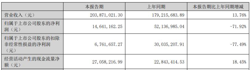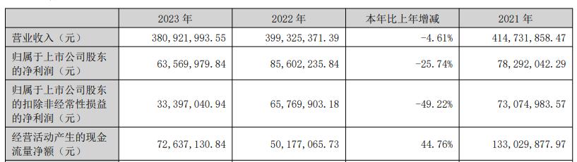 2023年,公司实现营业收入3.81亿元,同比下降4.61%;归属于上市公司股东的净利润6357.00万元,同比下降25.74%;归属于上市公司股东的扣除非经常性损益的净利润3339.70万元,同比下降49.22%;经营活动产生的现金流量净额为7263.71万元,同比增长44.76%。