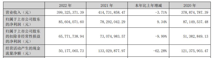 2022年,公司实现营业收入3.99亿元,同比下降3.71%;归属于上市公司股东的净利润8560.41万元,同比增长9.34%;归属于上市公司股东的扣除非经常性损益的净利润6577.17万元,同比下降9.99%;经营活动产生的现金流量净额为5017.71万元,同比下降62.28%。