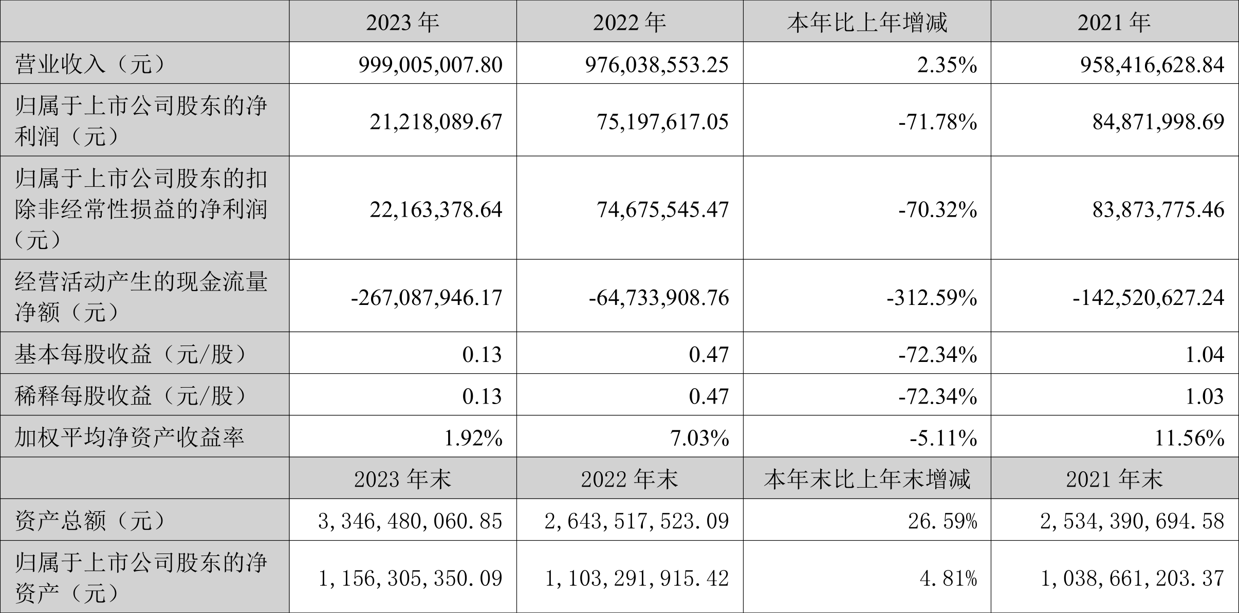 2023年,公司经营活动现金流净额为-2.67亿元,同比减少2.02亿元,主要系本期回款同比减少与支付增加所致;筹资活动现金流净额5.76亿元,同比增加5.68亿元,主要系本期发行可转债所致;投资活动现金流净额-3307.42万元,上年同期为9072.83万元,主要系本期投资联营企业及购买科研用地所致。