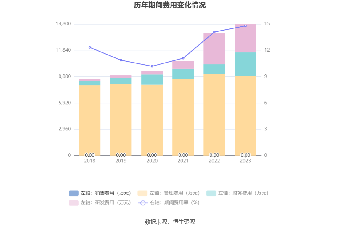 2023年,公司期间费用为1.48亿元,同比增长1021.92万元;期间费用率为14.79%,同比增长0.7个百分点。其中,管理费用同比下降2.19%,研发费用同比下降9.12%,财务费用同比增长139.24%。
