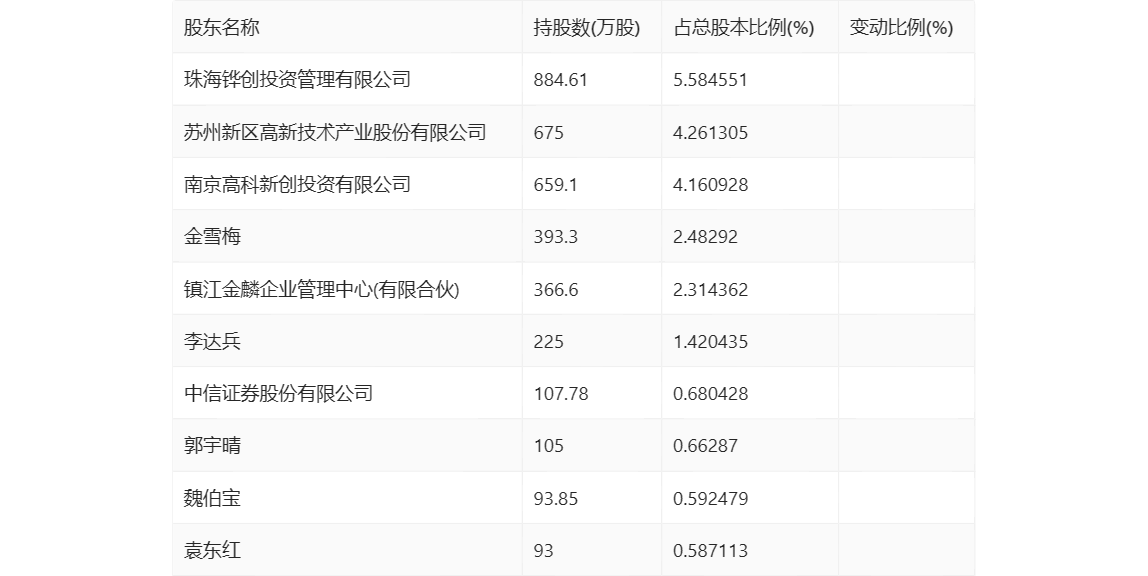 年报显示,2023年年末公司十大流通股东中,新进股东为袁东红,取代了三季度末的常静。在具体持股比例上,珠海铧创投资管理有限公司、苏州新区高新技术产业股份有限公司、南京高科新创投资有限公司、金雪梅、镇江金麟企业管理中心(有限合伙)、李达兵、中信证券股份有限公司、郭宇晴、魏伯宝持股有所下降。