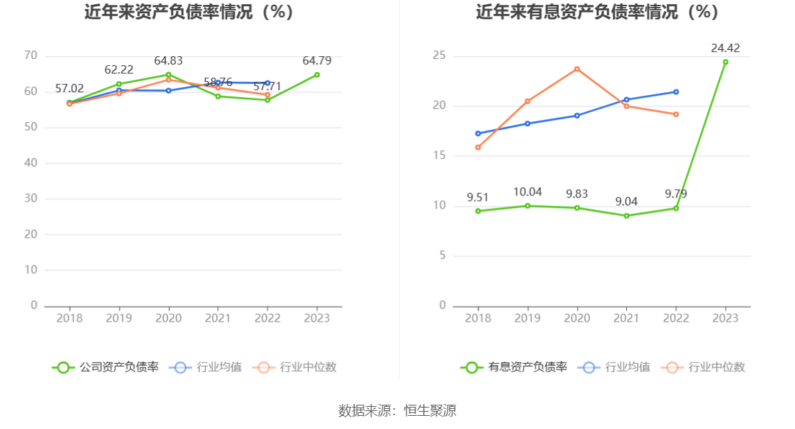 在偿债能力方面,公司2023年年末资产负债率为64.79%,相比上年末上升7.08个百分点;有息资产负债率为24.42%,相比上年末上升14.63个百分点。